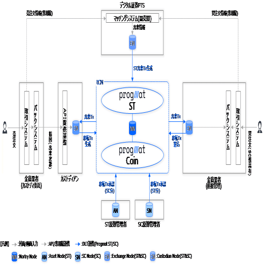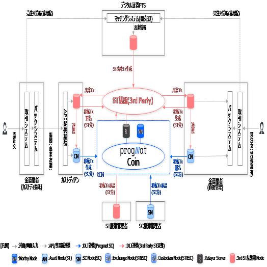 「Progmat Coin」はデジタルアセット業界標準の決済インフラを志向しており、「Progmat ST」以外のST基盤であっても連携可能とする想定です。こちらの場合は、デジタル証券PTSによるマッチング完了後、他のST基盤におけるPTS用NodeからST出来Txを回付し、当該Txを受領した金商業者側でST移転Txを回付すると共に、Progmat用Node(Custodian Node:CN)と連携し、CNからSCの移転Txも回付します。