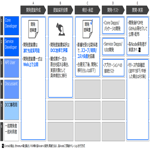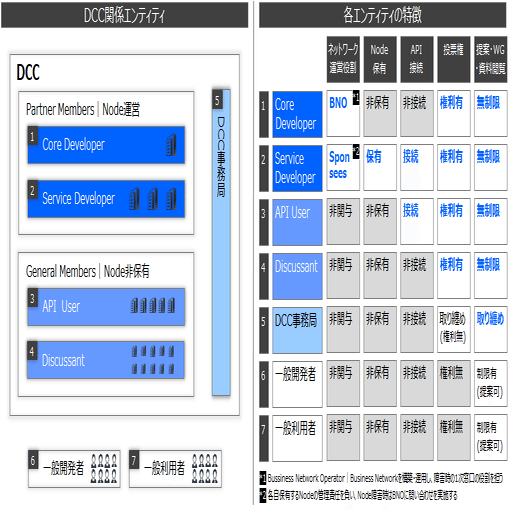 Node運営を担うかNode非保有かで、「Partner Members」か「General Members」という形式に分かれ、更にNode運営を担う「Partner Members」は「Core Developer(以下、Core Dev)」と「Service Dev」に分かれ、責任範囲を明確にしたうえで開発を推進する役割となります。なお、守秘義務を要しない開発提案はオープンに受付可能とし、開発提案の採択等重要な決定はDCC全会員による投票プロセスを経ることを想定しています。