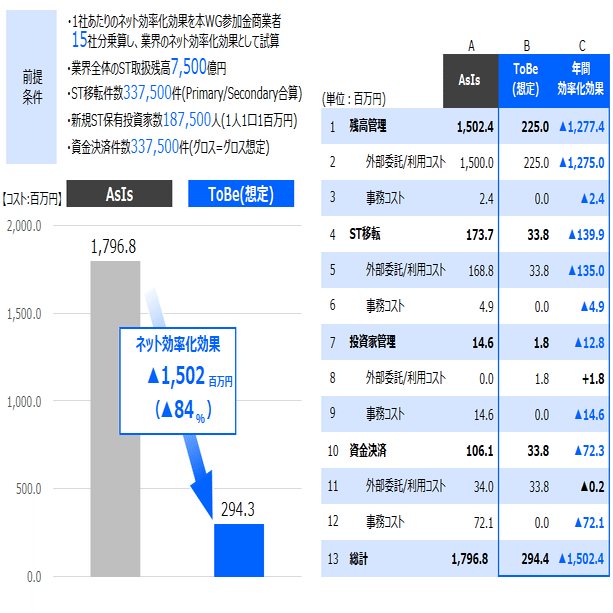 本WGではDLTをオープン化し、ポストトレードがワンストップで完結する仕組みになる場合の効果を定量的に算定しました。結論としては以下の図に示すように、オープン化前/既存の法定通貨決済の方式に比して、毎年約1,500百万円(84%)のネット効率化効果(Progmat利用コスト加味後)が想定されます。なお、ここでの試算は将来的なST取扱残高を証券会社1社あたり500億円、証券会社数を15社として、諸条件含めて仮定のうえ行っております。