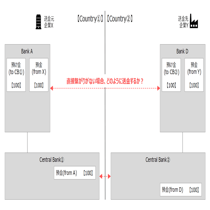 - 内国為替との最大の違いは、【Bank D】がCentral Bankの当座預金を介して繋がっている先ではないという点