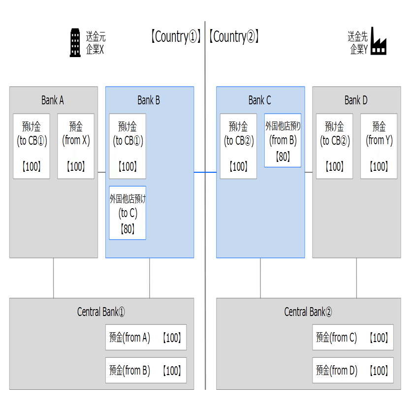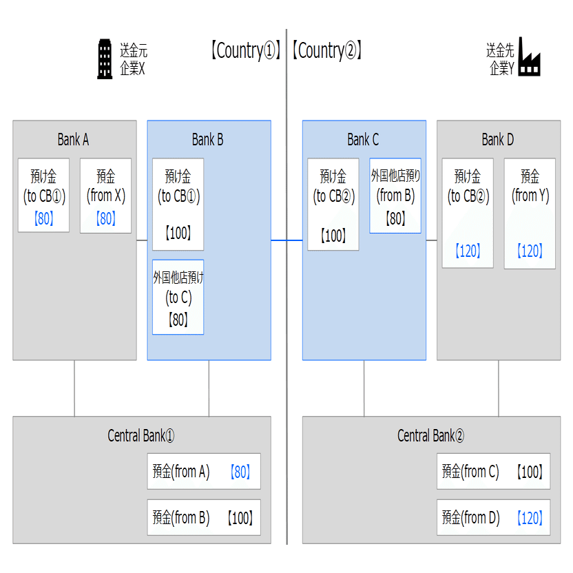 図表の中で薄青色でハイライトしている【Bank B】がCountry①におけるコルレス銀行、【Bank C】がCountry②におけるコルレス銀行、です。