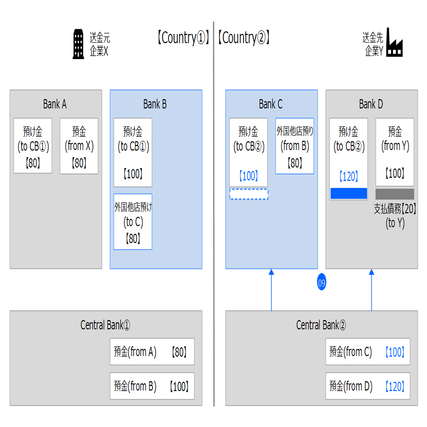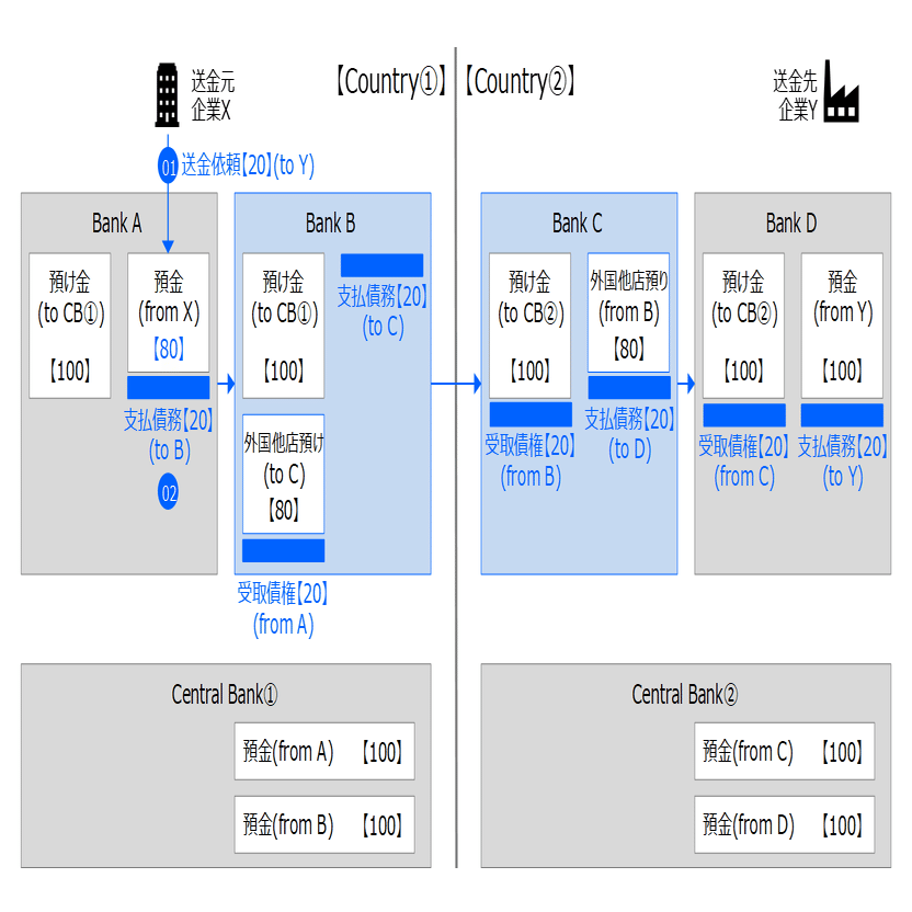- ②:【Bank A】には【Bank D】に対する支払債務が、【Bank D】には【Bank A】からの受取債権と同時に【Y】への支払債務が、それぞれ[20]ずつ発生する