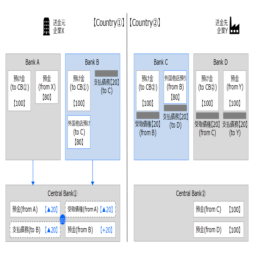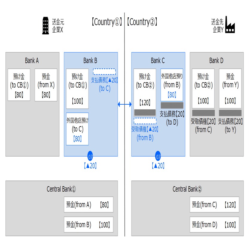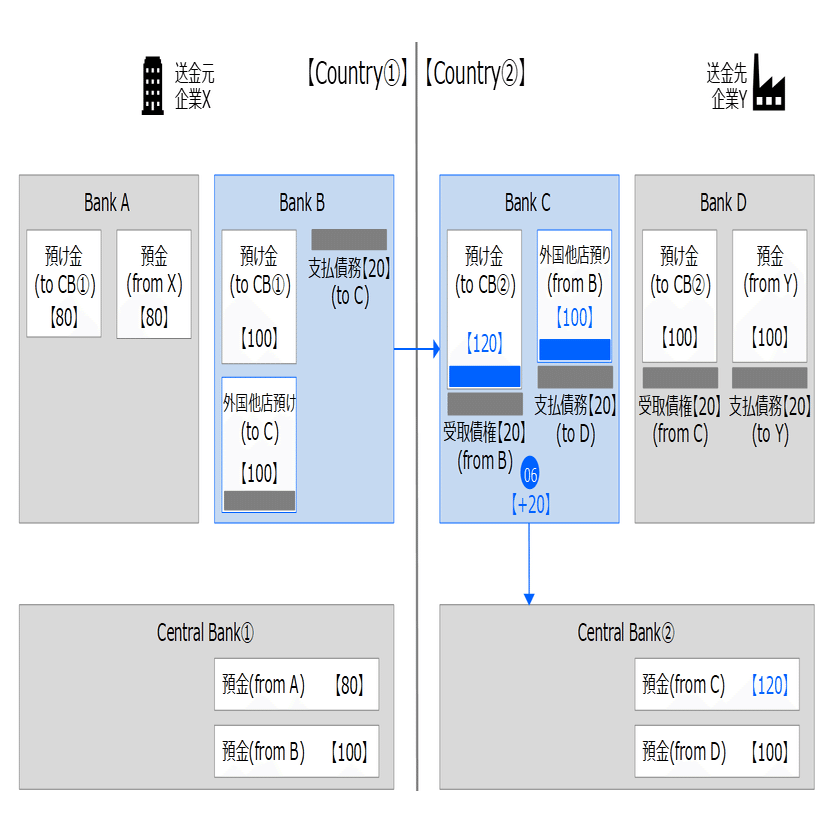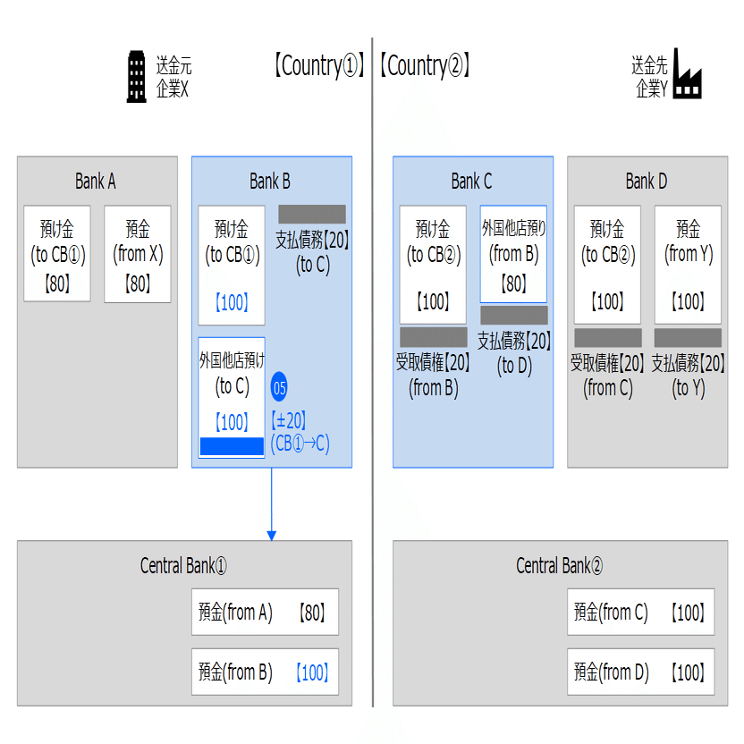- ⑤:【Bank B】内で、中銀預け金残高から【Bank C】への預け金残高へ[20]を振替