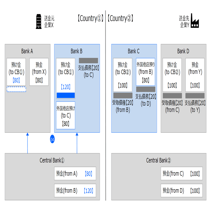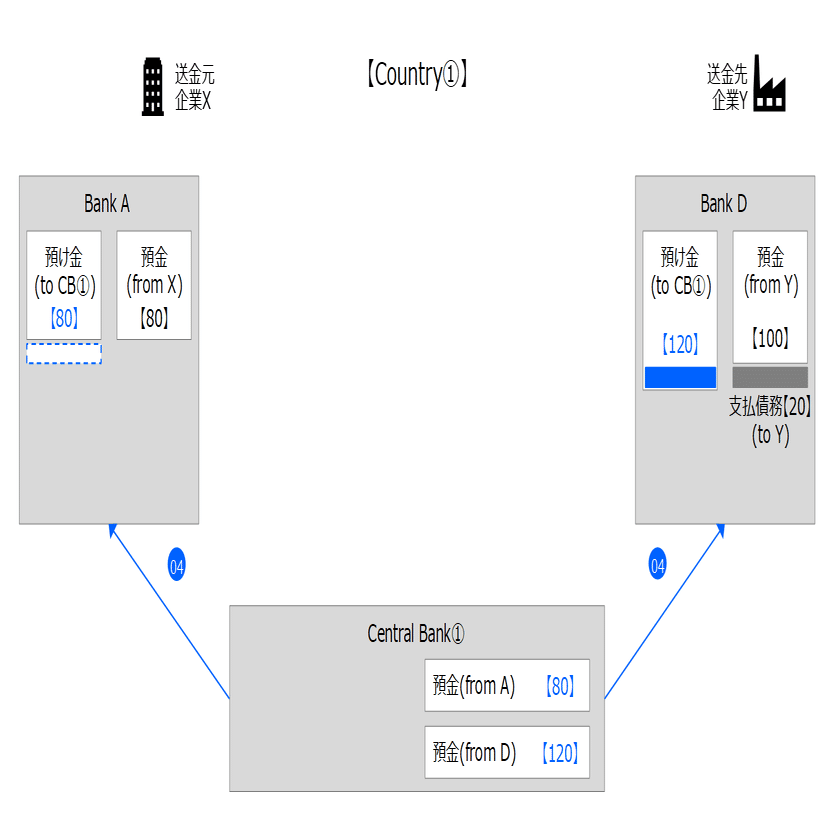 - ④:【Bank A】の【Central Bank①】への預け金残高が[80](100‐20)になる