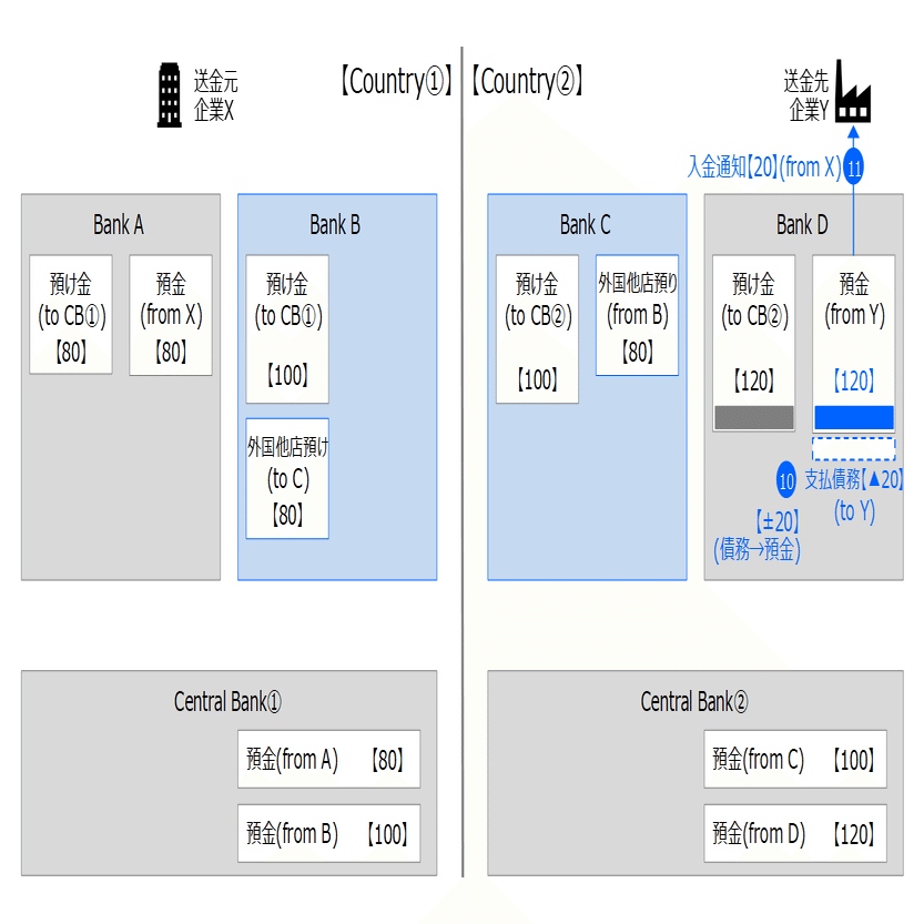 - ⑩⑪:【Bank D】から【Y】への入金通知までは内国為替と同様