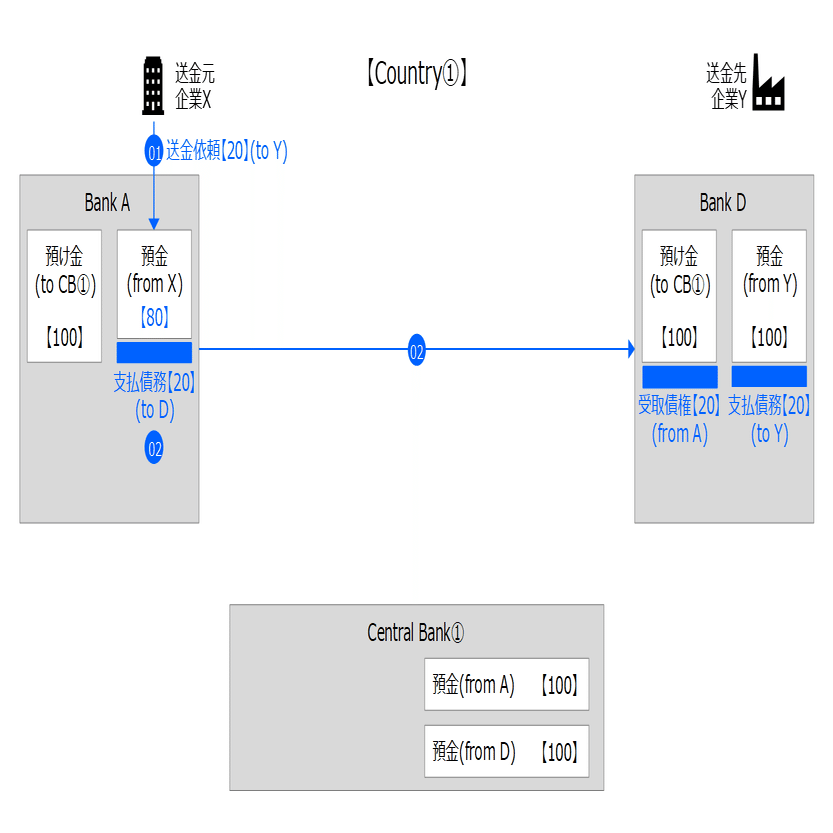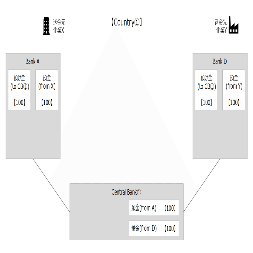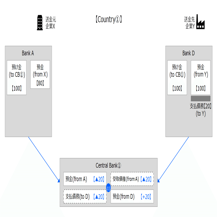 - ③:【Bank A】と【Bank D】間の債権/債務を清算し、差額を【Central Bank①】内の当座預金振替(【A】残高→【D】残高)によって決済する