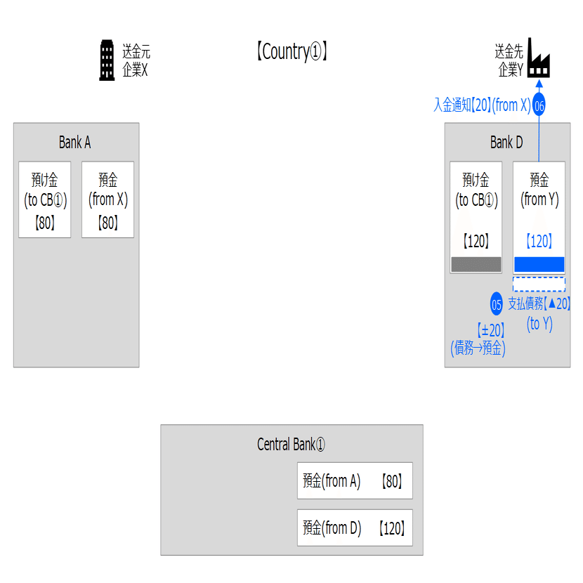 - ⑤:【Bank D】において【Y】への支払債務[20]を解消し、代わりに【Y】からの預金(債務)を[120](100+20)に増やす
